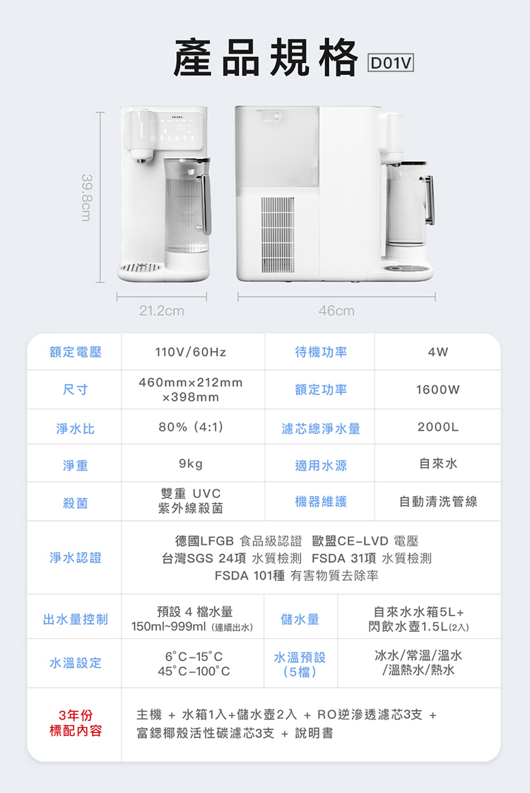 | 本套組包含 | D01V機器 + 抗菌水箱*1 +PCTG 水壺*2 + RO濾芯*3 + 椰殼濾芯*3